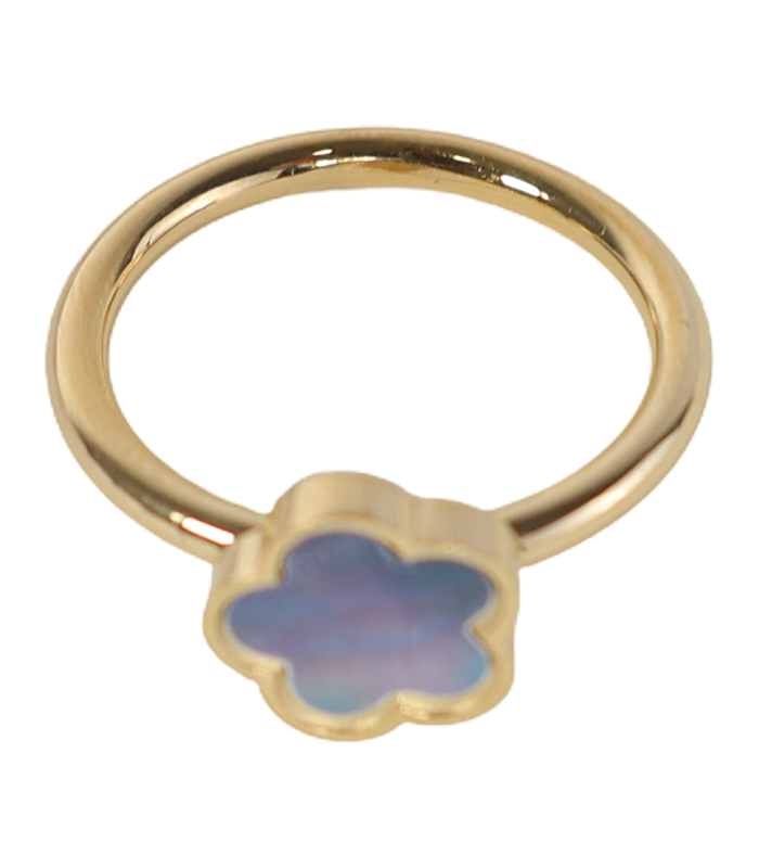 Un delicado anillo con banda dorada y un charm central de flor de cuatro pétalos, elaborado con auténtico nácar iridiscente en tonos aqua y turquesa.
