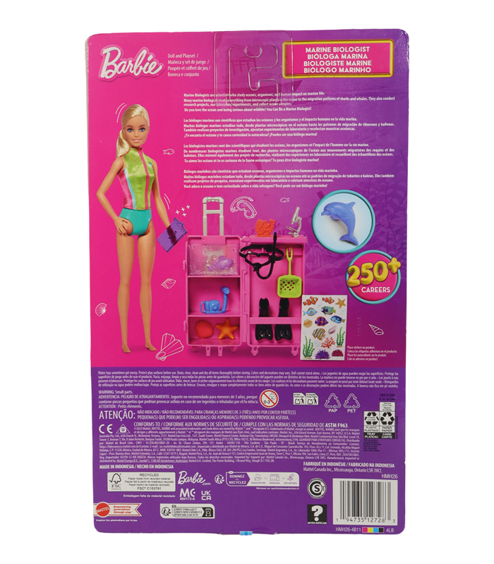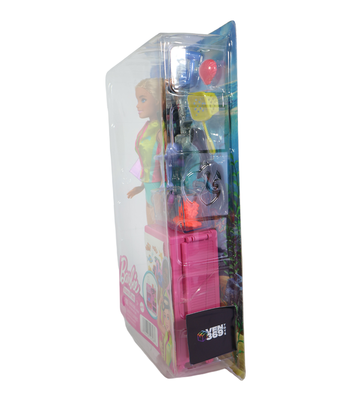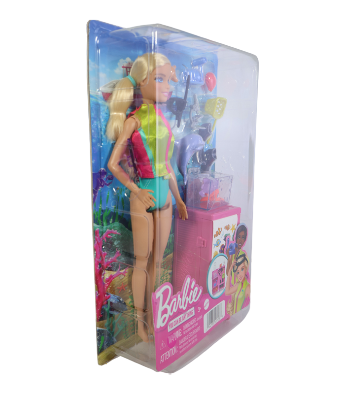 La muñeca Barbie cuenta con un atuendo de buceo de colores vibrantes (verde neón y turquesa) y viene equipada con todo lo necesario: aletas de buceo, máscara y snorkel. Los accesorios adicionales incluyen una red de exploración, un acuario móvil (tanque), coral, criaturas marinas y una figura de un delfín.