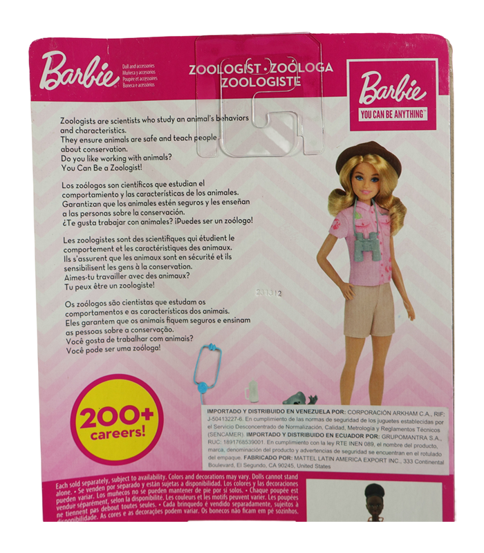 Sumérgete en el mundo del cuidado animal y la biología con la muñeca Barbie Zoóloga. Diseñada para fomentar el juego de roles y mostrar a las niñas que ‘Tú puedes ser lo que quieras’, esta Barbie está lista para expediciones en la selva o el bosque.