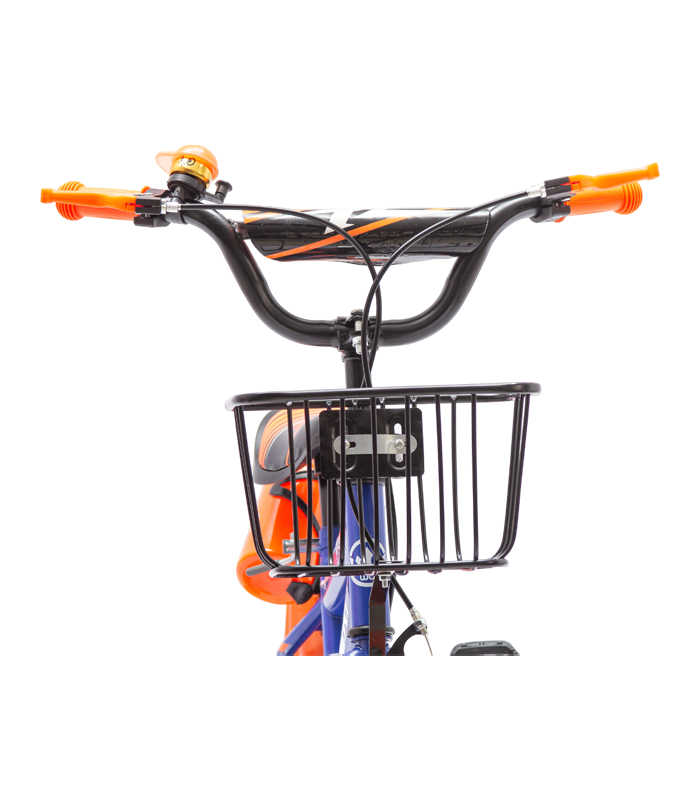 Bicicleta robusta para niños en azul y naranja, ideal para aprender a montar con seguridad gracias a sus ruedas auxiliares, cesta delantera y botella de agua.