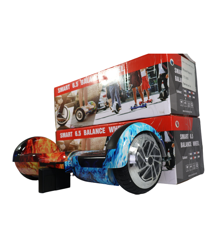 Deslízate con estilo en esta patineta eléctrica autoequilibrada con un impactante diseño de flamas rojas y azules, perfecta para destacar en cualquier lugar.