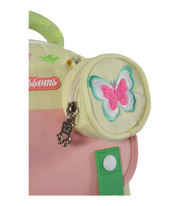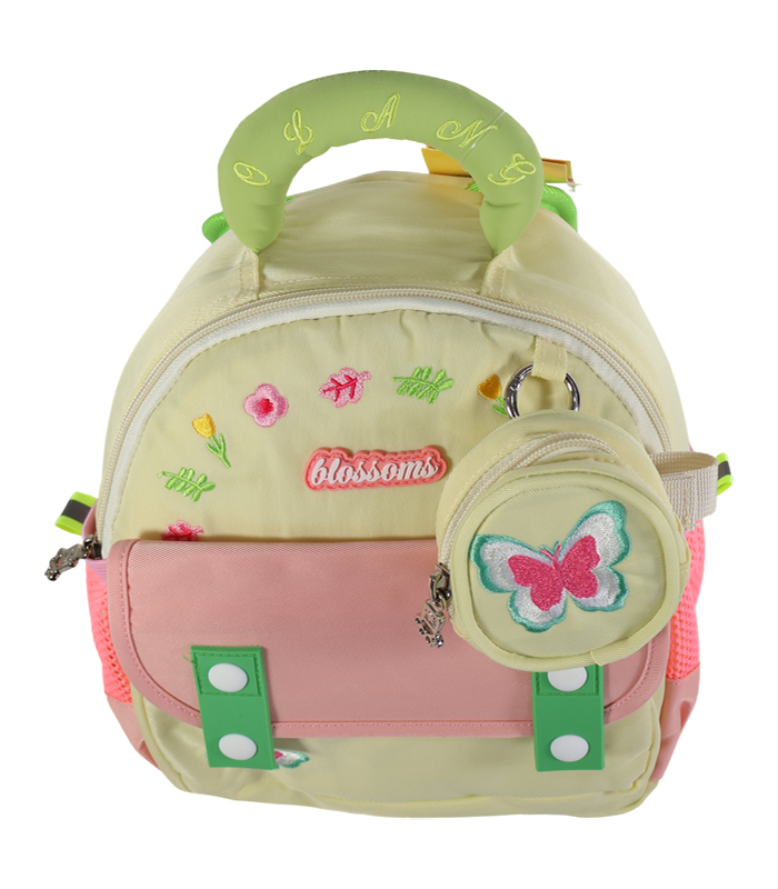 Esta adorable mochila infantil está diseñada para hacer que cada día sea una aventura. Confeccionada en tonos suaves de amarillo pastel y rosa, y adornada con delicados bordados de flores y mariposas, es perfecta para llevar juguetes, aperitivos o útiles pequeños. Cuenta con una solapa frontal segura, bolsillos laterales de malla para botellas pequeñas y un asa superior acolchada en verde lima para un fácil agarre, asegurando comodidad y estilo para su pequeña. Además, incluye un pequeño monedero circular a juego que se puede quitar, proporcionando una solución de almacenamiento versátil y divertida.