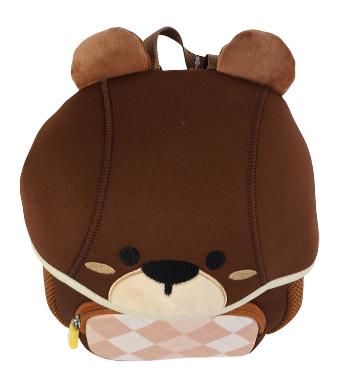 Una adorable mochila de neopreno con diseño de oso, perfecta para los primeros años escolares o la guardería. Incluye un bolsillo frontal con patrón de cuadros y bolsillos laterales de malla.