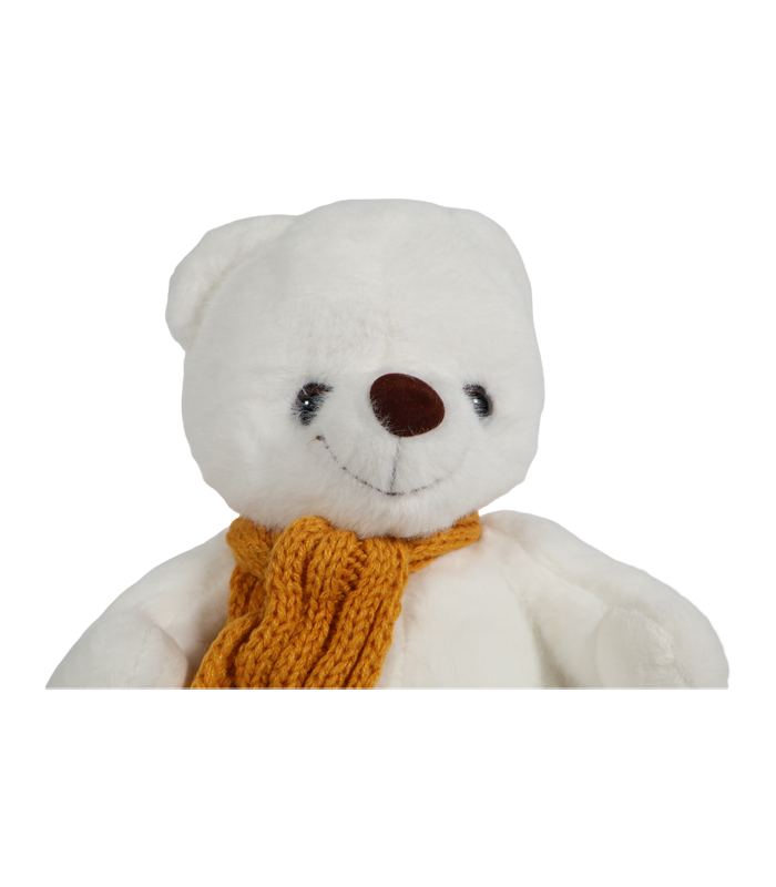Este encantador osito de peluche blanco es el compañero perfecto para todas las edades, ofreciendo una sensación de calidez y confort inmediata gracias a su pelaje extra suave y mullido. Su diseño clásico se realza con una bufanda de punto color mostaza y rayas blancas, dándole un toque invernal y adorable. Ideal para regalar en ocasiones especiales, como cumpleaños o fiestas navideñas, o simplemente para añadir un abrazo suave a cualquier habitación infantil. Sus ojos brillantes y su nariz cosida de color marrón le otorgan una expresión dulce y amigable que lo convierte en el amigo inseparable de los más pequeños.