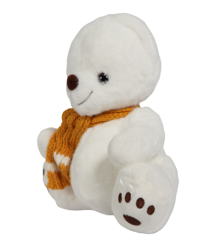 Un tierno osito de peluche de color blanco cremoso, con una suave textura y una acogedora bufanda de punto naranja mostaza. Perfecto para abrazar y coleccionar.