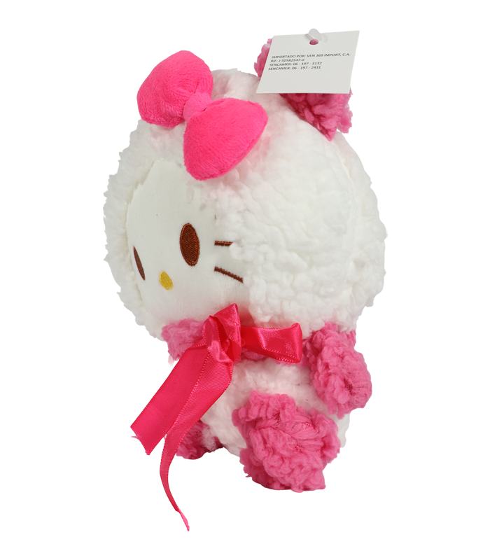 Un adorable peluche de Hello Kitty envuelta en un suave y esponjoso traje de sherpa rosa y blanco. Perfecto para abrazar y coleccionar, con su icónico lazo fucsia.