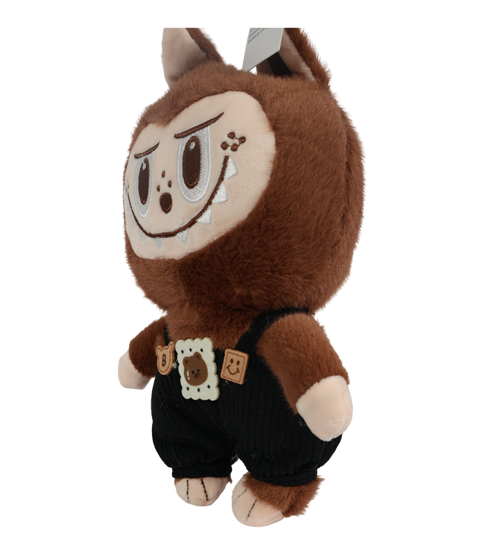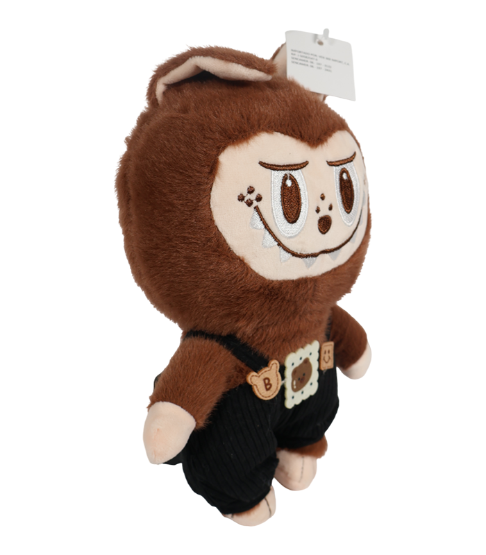 Adorable peluche Labubu de la serie ‘The Monsters’ en color marrón, vestido con un simpático overol negro. Perfecto para coleccionistas y fans de los juguetes de arte.